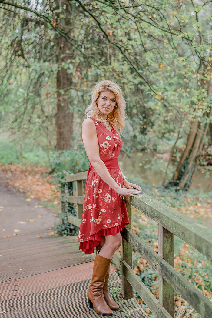 Deze jurk staat prachtig bij elk figuur en in elke maat! Pretty modellen die je in de foto’s ziet zijn echte moeder en dochters. Ze dragen een mouwloze Flame jurk in het rood met crèmekleurige bloesems, en de rok heeft onderaan leuke ruches in dezelfde donkerrode kleur. De mooie modellen dragen hier de maten 36/104, 38, en 40/110.