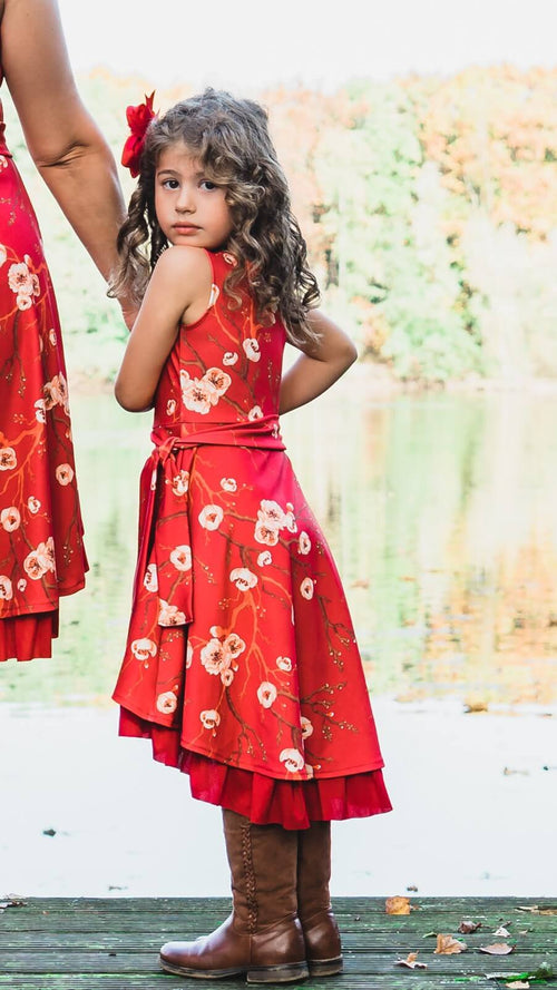 Deze thee-lengte jurk staat prachtig in het rood met crèmekleurige sakura bloesems. Een fantastische twinning jurk voor een verjaardagsfeest of huwelijk. Jullie gaan hierin zeker opvallen!